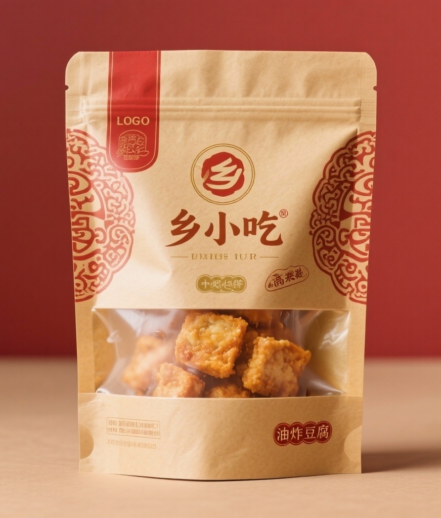 - **产品**:油炸豆腐 - **品牌名**:乡小吃 - **包装样式**:食品复合袋 - **设计风格**:复古中式风格 - **设计元素**:品牌LOGO、传统花纹、开窗设计、产品图像 - **主题配色**:牛皮纸色为主,配红色和金色