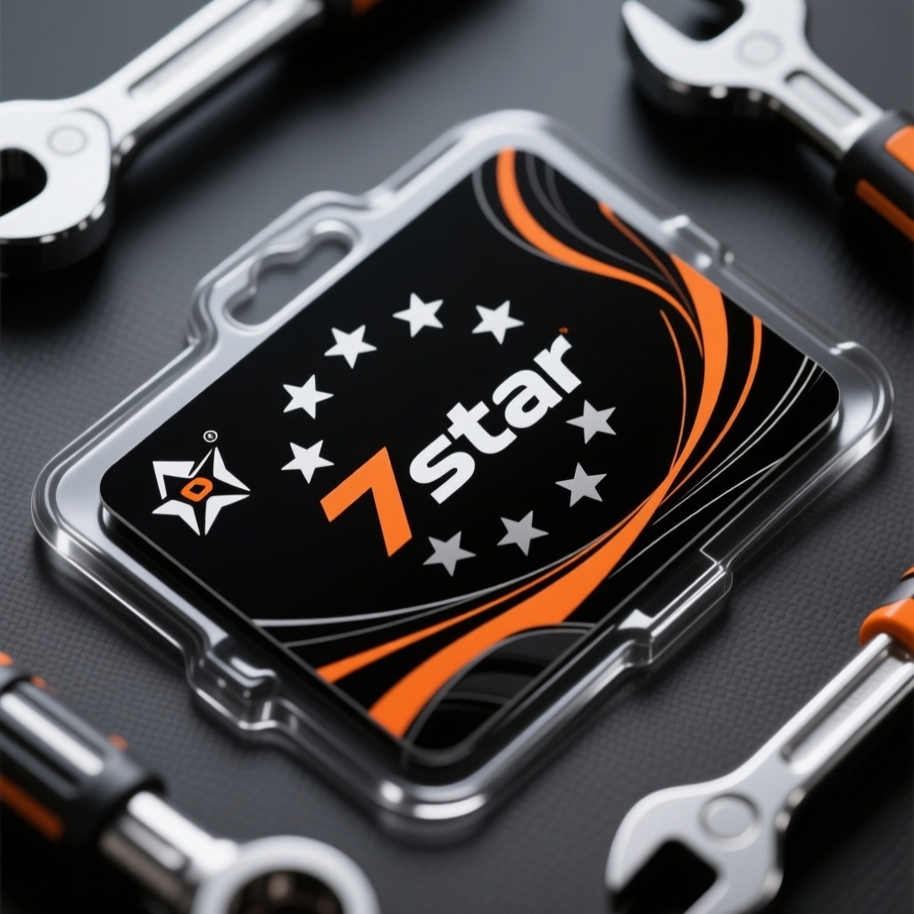 - **产品**:五金工具 - **品牌名**:7star - **包装样式**:吸塑卡包装 - **设计风格**:现代工业风格 - **设计元素**:品牌logo、七星阵列、工具剪影、动态线条 - **主题配色**:黑色、银色、橙色