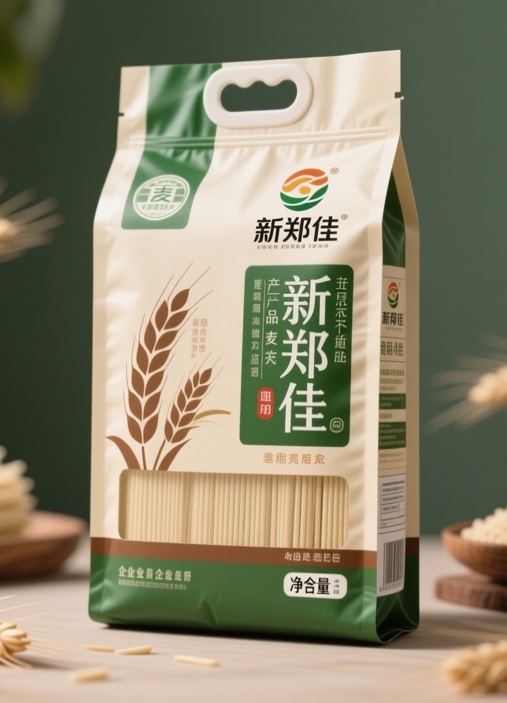 **产品**:麦芯挂面 **品牌名**:新郑佳 **包装样式**:袋装 **设计风格**:简约自然风 **设计元素**:麦穗图案、品牌标识、产品名称、企业标语、净重标注 **主题配色**:米色、绿色、棕色