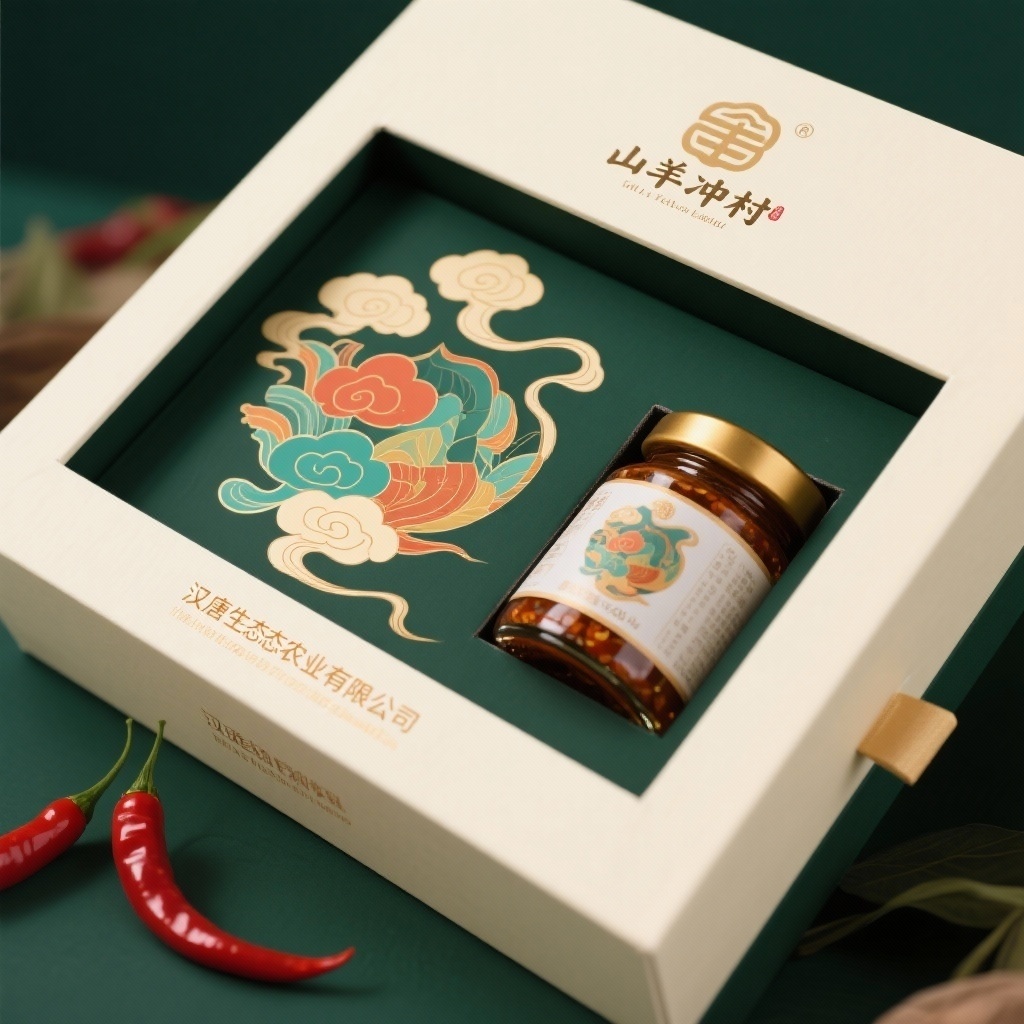 - **产品**:酱辣椒(玻璃瓶装400g) - **品牌名**:汉唐生态农业有限公司 - **包装样式**:礼品盒 - **设计风格**:国潮插画 - **设计元素**:颜色丰富、祥云图案、右上角"山羊冲村"标识 - **主题配色**:米白色、深绿色、金棕色