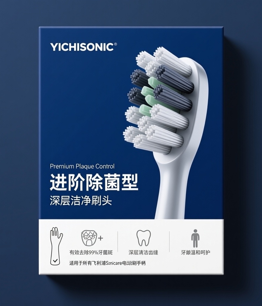 为“YICHISONIC”品牌的电动牙刷替换刷头设计一款85mm×95mm反向插锁盒正面包装,产品系列为“进阶除菌型”(Premium Plaque Control),兼容所有飞利浦Sonicare手柄。整体采用现代科技感风格,主色调为深蓝(#0A2463),传递专业与洁净。左上角为白色无衬线字体“YICHISONIC”品牌标识,清晰醒目。中央占据60%以上面积为高精度刷头渲染图:展示高密度交叉植毛结构,刷毛呈深灰与银白交织,背景干净,刷头微倾增强立体感,表面带有钻石银(#C0C6D4)高光,突出科技质感。刷头图下方为中文产品名称——主标题“进阶除菌型”使用大号加粗白色字体,副标题“深层洁净刷头”以较小字号浅灰白呈现。包装底部横向排列三个核心卖点图标与文字:银色除菌图标+“有效去除99%牙菌斑”、牙齿轮廓图标+“深层清洁齿缝”、简约人形图标+“牙龈温和呵护”,图标精致,文字为白色细体。最底部以清晰小字标注“适用于所有飞利浦Sonicare电动牙刷手柄”,左侧配一个极简手柄轮廓与对勾组合图标(钻石银色)。全图除系列名意译为中文外无任何英文,信息层级分明,视觉聚焦刷头本身,工艺建议高光UV突出刷毛细节与品牌标识。