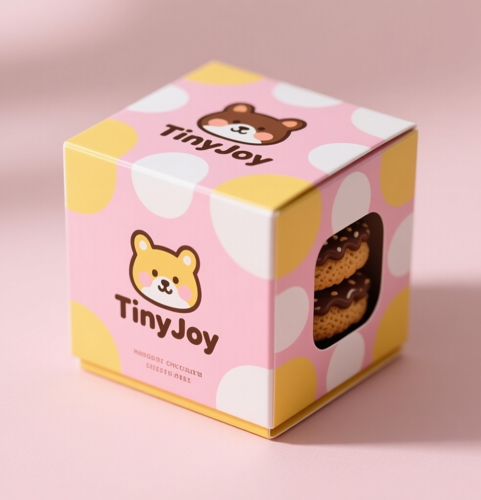 - **产品**:手工巧克力饼干 - **品牌名**:TinyJoy - **包装样式**:立方体盒 - **设计风格**:可爱简约风格 - **设计元素**:卡通动物图标和几何波点图案 - **主题配色**:粉色、黄色、白色