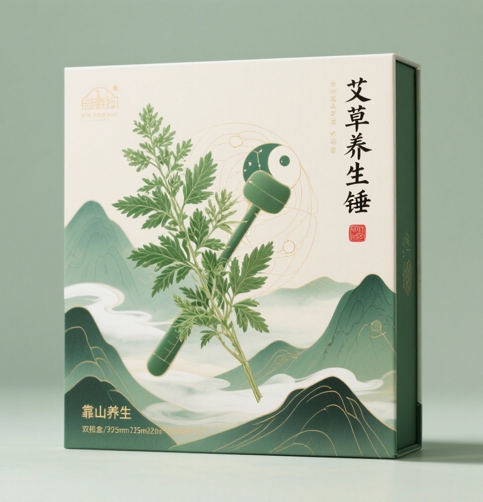 为“艾草养生锤”品牌设计一款双插盒包装(尺寸95mm×95mm×270mm),采用新中式插画风格,融合自然与养生意境。主视觉为一束饱满鲜嫩的艾草,叶片微微飘散,充满生命力;背景为层叠起伏的大山轮廓,山间缭绕淡雅云雾,营造“靠山养生”的宁静氛围;细节处融入若隐若现的太极图案、经络穴位线条及草本肌理纹理,强化养生主题;品牌名称“艾草养生锤”以书法字体呈现,置于盒面右上黄金分割位,搭配一枚朱砂红印章,古朴雅致。整体配色以艾草绿(#6B8E23)为主色,奠定自然疗愈基调;点缀色采用米白(#F5F0E6)用于云雾与文字,提升通透感;辅助色使用深墨绿(#2F4F2F)勾勒山体轮廓与细节,增强层次与传统韵味。包装表面采用环保哑光材质,局部烫金工艺突出品牌标识,整体风格多元而不杂乱,兼具文化感与现代审美。