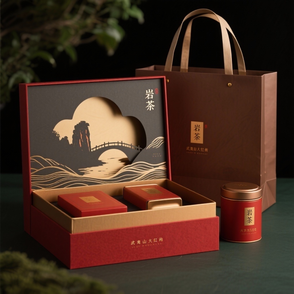 - **产品**:武夷山大红袍礼盒 - **品牌名**:岩茶 - **包装样式**:礼盒、茶罐、手提袋 - **设计风格**:新中式极简美学 - **设计元素**: - 主视觉:武夷山丹霞地貌剪影,桥洞透空设计映出内衬茶色 - 辅助图形:九曲溪波纹演变底纹 - 材质碰撞:哑光朱红卡纸 + 触感绒面内衬 - **主题配色**: - 主色:赭石色、深褐色、岩石灰 - 辅色:暗金色、古铜色 - 点缀色:墨绿或茶汤的琥珀色