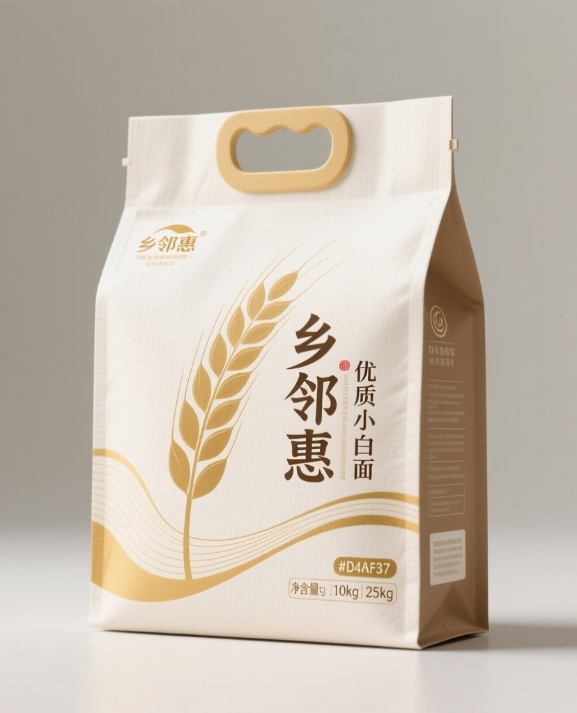 为“乡邻惠”品牌的小麦面粉精心设计一款复合材质手提袋包装,整体风格简约高雅、清新质朴,传达健康与天然的理念。包装以自然色调为主,主色为米白(#F5F0E6),营造干净清爽的视觉感受;点缀色采用金色(#D4AF37),用于勾勒小麦轮廓与品牌标识,提升高端质感;辅助色为浅褐(#D2B48C),用于抽象纹理与信息区块,增强自然亲和力。设计元素包括:主视觉为饱满优质的小麦穗图案,象征“优质小麦”与“小麦白面”;背景采用大面积留白与细微磨砂质感,体现“自然原香”的纯净感;细节处融入金色线条与抽象麦浪纹理,低调中彰显精致;品牌名“乡邻惠”以简约字体置于袋面中央,搭配净含量标识(5kg、10kg、25kg)清晰分区排布,整体构图平衡、留白得当,充分展现产品的高端品质与天然属性。