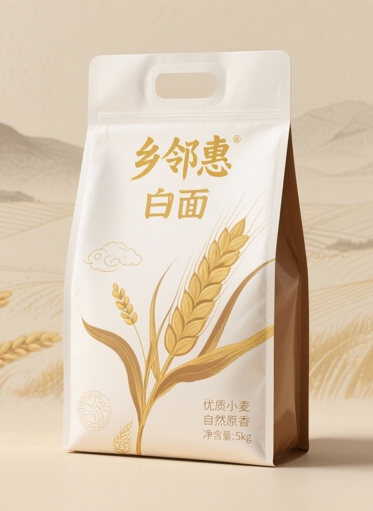 为“乡邻惠”品牌5kg白面(小麦面粉)设计一款高端复合材质手提袋包装,融合国潮插画与现代简约风格,以东方美学为基调。主色调采用温润沉稳的大地色系——主色为浅橄榄褐(#A69A85),传递田野的厚重与自然的包容感;点缀色为哑光金(#D4AF37),用于书法字体与核心图案,营造温暖而高级的视觉层次。主视觉以国潮手法重构小麦元素:一株抽象麦穗从底部生长而上,线条兼具传统水墨的流动感与现代插画的简洁,麦粒部分融入微小的祥云与谷纹符号,寓意丰收与吉祥;背景以极淡的宣纸肌理为底,叠加若隐若现的远山轮廓与风动麦浪的浅金线条,增强空间纵深与轻盈通透感。品牌名“乡邻惠”采用定制金色书法字体,笔触遒劲而温润,居中置于包装上部,极具文化识别度;产品名“白面”以小号金体无衬线字置于其下,协调统一。底部清晰标注“优质小麦 自然原香”及“净含量:5kg”,字体采用浅米灰(#EDE8DD),信息清晰而不喧宾夺主。整体构图留白得当,材质结合磨砂覆膜与局部烫金工艺,细节丰富而克制,精准诠释高端天然面粉“源自田野、归于纯粹”的品牌精神。