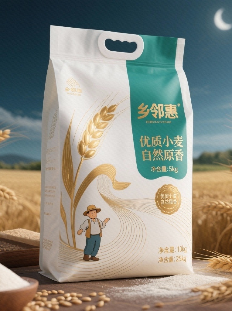 极简抽象麦田线条、烫金麦穗几何图形、凹印品牌名"乡邻惠"、"优质小麦 自然原香"镀膜标语、净含量标识、小麦粒微距图案
