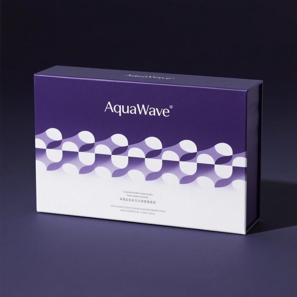 - **产品**:多肽美容饮品 - **品牌名**:AquaWave - **包装样式**:礼品盒 - **设计风格**:极简欧普艺术风格 - **设计元素**:几何海洋波浪、极简重复律动排列 - **主题配色**:深紫色到白色渐变
