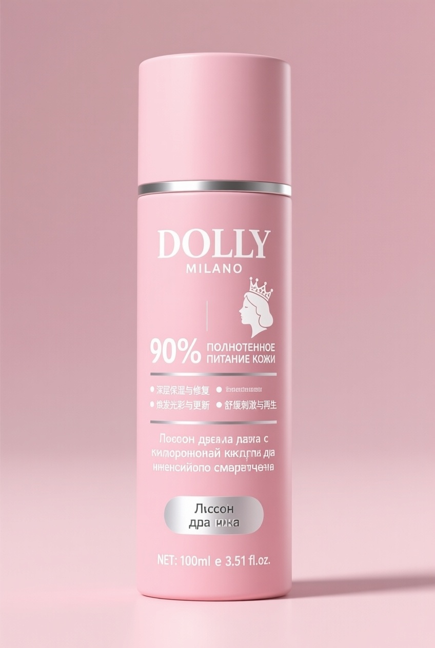 一个高端面部柔肤水瓶的8K高清3D渲染图。瓶身为PETG实色哑面柔和质感的圆柱体,颜色为柔和粉红色。背景为浅粉渐变。光影采用柔和的HD/8K级别渲染效果。瓶身设计100%复刻参考图:顶部中央是白色大写“DOLLY MILANO”;下方有一条银灰色分隔线;左侧是白色“90%”,右侧是白色戴皇冠女性侧脸图标及白色俄文“ПОЛНОЦЕННОЕ ПИТАНИЕ КОЖИ”;接着是三条带白色圆点符号的俄文功效列表(深层保湿与修复、焕发光彩与更新、舒缓刺激与再生),列表之间有银灰色分隔线;中部偏下是白色产品全称“Лосьон для лица с гиалуроновой кислотой для интенсивного смягчения”;底部中央是一个浅银色椭圆形标签,内含白色“Лосьон для лица”;最底部是白色容量“NET: 100ml e 3.51 fl.oz.”。