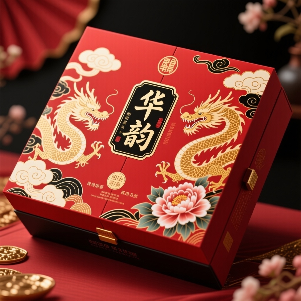 - **产品**:白酒 - **品牌名**:华韵 - **包装样式**:礼品盒 - **设计风格**:国潮插画 - **设计元素**:龙纹插画、云纹图案、书法字体、牡丹花元素 - **主题配色**:红色、金色、黑色