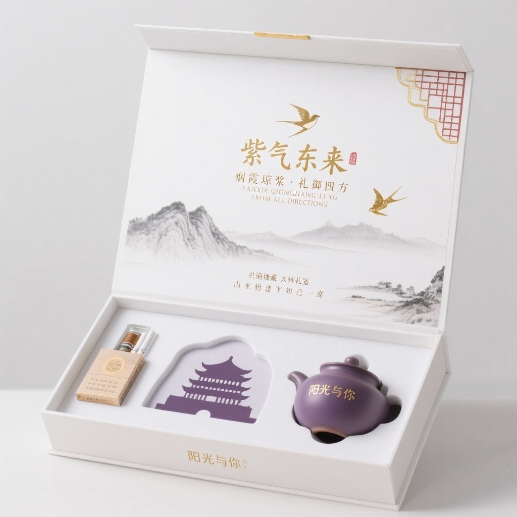 为“阳光与你”品牌设计一款高端烟酒茶三合一礼盒,内装100ml白酒、一盒香烟与一件建水紫陶。包装为16:9竖向细长天地盖硬盒(高32cm×宽18cm),合盖状态,纯白底背景。采用新中式轻奢风格,工笔山水与现代极简融合,强调留白与触感。主视觉为建水紫陶器形轮廓,器身内巧妙嵌入朝阳楼与燕子洞山形剪影;背景为宣纸白(#FDFCF9)底,仅以极淡水墨山峦肌理若隐若现;盒盖边缘饰以朱家花园窗棂纹的纤细金线,一只飞燕以古金(#C9A96E)烫金勾勒,轻盈掠过“紫气东来”口号旁。文案布局严谨:顶部烫金书法“紫气东来”,中部主标题“烟霞琼浆·礼御四方”配英文“YANXIA QIONGJIANG LI YU FROM ALL DIRECTIONS”,下方副标题“共销臻藏 大师礼鉴”与小标“山水相逢丨知己一席”分列左右,品牌名“阳光与你”低调置于盒底。所有文字采用凹印+局部UV工艺,主色深紫褐(#4A354F)用于紫陶轮廓与标题,古金(#C9A96E)用于烫金细节。材质为350g特种艺术纸,覆触感膜,结合烫金、凹印与局部UV三重工艺,呈现收藏级礼盒的温润与奢华。