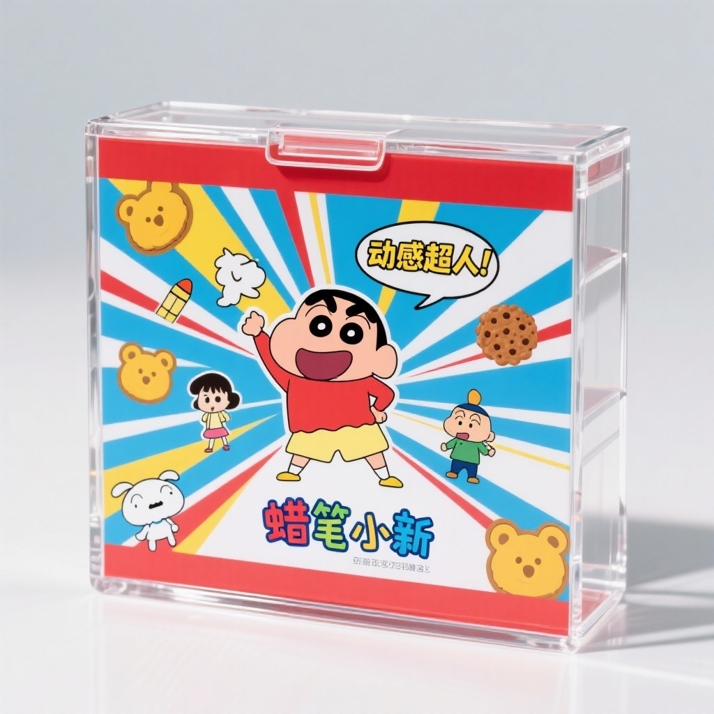 为“蜡笔小新”品牌的文具设计一款亚克力收纳盒,采用透明高透光亚克力材质,盒体简洁现代,正面嵌入彩色插画印刷面板。设计延续日系卡通插画风格,高度还原动画原作氛围。主视觉为蜡笔小新标志性的叉腰大笑pose,表情生动醒目;背景融入动感流畅的线条、经典对话框“动感超人!”以及小熊饼干图案;细节处点缀小白、美冴、风间等角色的可爱剪影,增强IP辨识度;品牌标识“蜡笔小新”使用原版动画字体,置于面板中央下方,清晰易读。主题配色以主色红色(#FF4500)奠定活力基调,点缀色明黄色(#FFD700)用于高光与重点元素提亮,辅助色天蓝色(#87CEFA)与白色(#FFFFFF)用于背景与细节平衡,整体色彩明快清新。印刷面板采用高清UV彩印工艺,色彩饱和耐刮,与透明亚克力盒体形成通透与趣味的对比,既实用又充满童趣,完美契合儿童及动漫爱好者文具收纳需求。