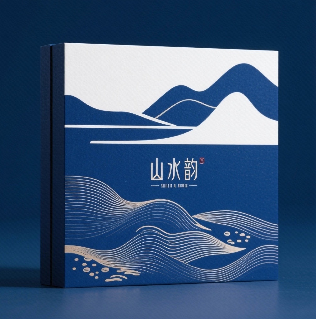 - **产品**:茶饼 - **品牌名**:山水韵 - **包装样式**:礼品盒 - **设计风格**:简约现代 - **设计元素**:抽象山脉线条与水波纹样 - **主题配色**:深蓝色为主,搭配白色点缀