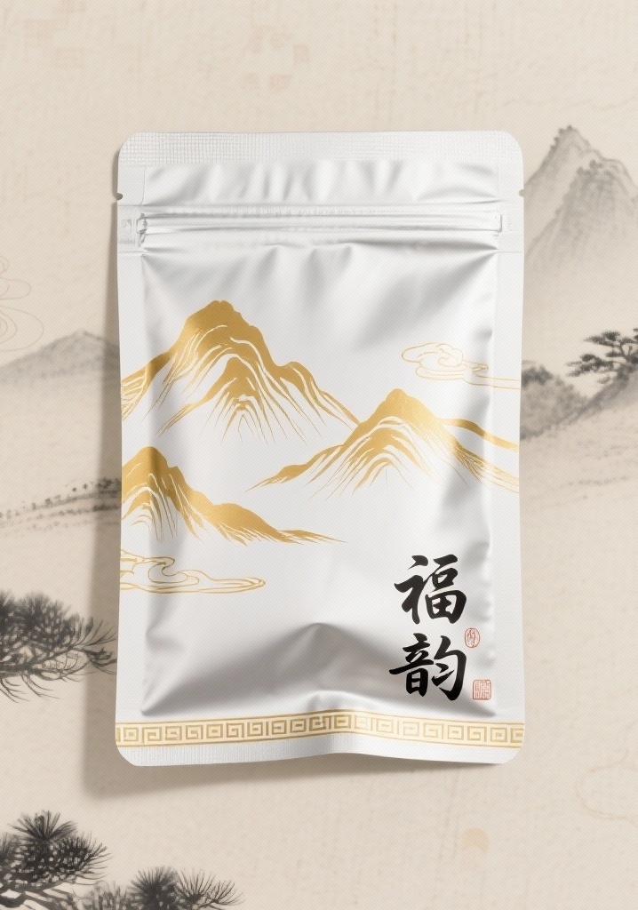 为“福韵”品牌的茶叶精心设计一款铝箔包装袋,整体风格转为典雅庄重的古典风格,深植中国传统美学。设计元素包括:主视觉为金色山峦,以精细流畅的金线条勾勒出层叠远山,线条带有传统山水画的韵律感;背景采用仿古宣纸肌理,搭配淡雅水墨晕染的远山、云气或松枝,营造古画意境;细节处融入古典纹样如回纹、云纹或窗棂图案作为边饰,低调而不喧宾夺主;品牌标识“福韵”采用苍劲古朴的毛笔书法字体,墨色沉稳,部分笔画可做烫金处理,置于画面中央或右下方,符合传统书画题款布局。主题配色以主色米白或仿古白(#F8F3E6)为基底,模拟宣纸年代感;点缀色金色(#D4AF37)用于山峦线条与字体局部,彰显尊贵;辅助色为水墨黑(#2F2F2F)与淡赭石(#D2B48C),用于水墨渲染与古典纹理,整体色调温润雅致,传递出深厚的文化底蕴与茶道精神。