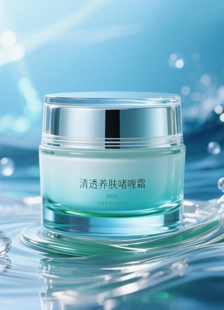 - **产品**:清透养肤啫喱霜 - **品牌名**:无 - **包装样式**:玻璃罐 - **设计风格**:轻奢自然海洋风 - **设计元素**:海洋波纹与光晕粒子,水滴与流动感纹理,底部层叠渐变,产品名字“清透养肤啫喱霜” - **主题配色**:海洋蓝(#5BC0EB),植萃绿(#7CC9A4),银白(#E8E8E8)