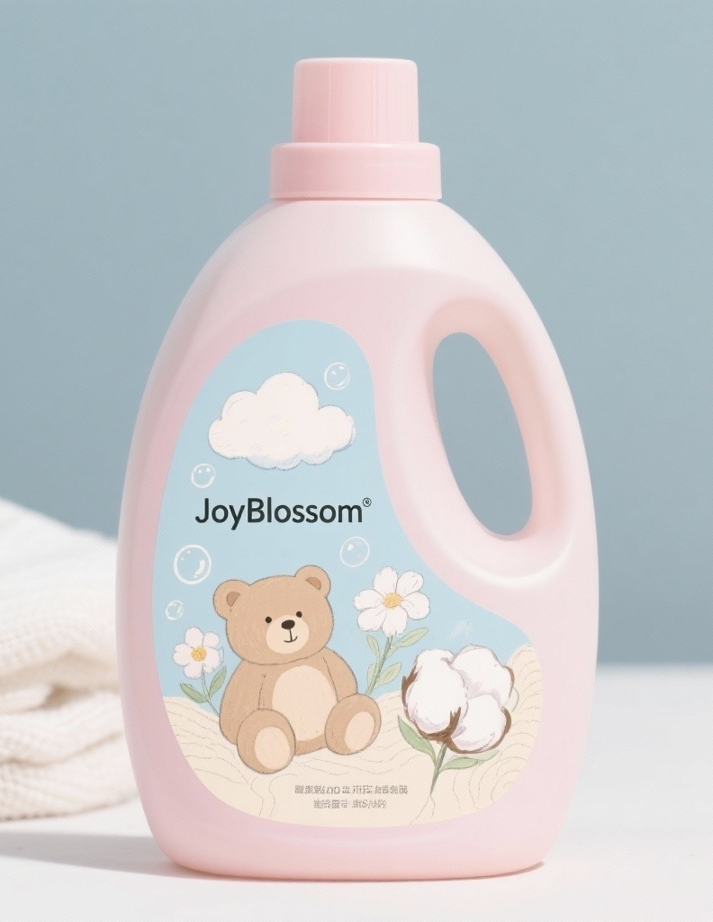 - **产品**:洗衣液 - **品牌名**:JoyBlossom - **包装样式**:瓶身标签 - **设计风格**:手绘插画 - **设计元素**:手绘小熊、云朵、气泡、花朵和棉质纹理插图 - **主题配色**:柔粉、淡蓝、奶油白