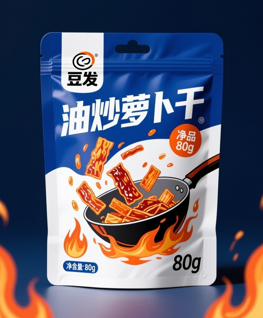 - **产品**:爆炒香辣萝卜干 - **品牌名**:豆发 - **包装样式**:袋装 - **设计风格**:现代活力风格 - **设计元素**:动态炒制萝卜干插画(锅中翻炒场景)、品牌商标“豆发”、产品名“油炒萝卜干”、净含量“80g”、火焰/热油元素点缀 - **主题配色**:深蓝色、亮白色、火焰橙(点缀色) (注:严格遵循用户需求,采用蓝色为主色调,以动态炒菜插画强化产品属性,火焰橙仅作少量点缀呼应“爆炒”概念,未额外添加冗余元素。)