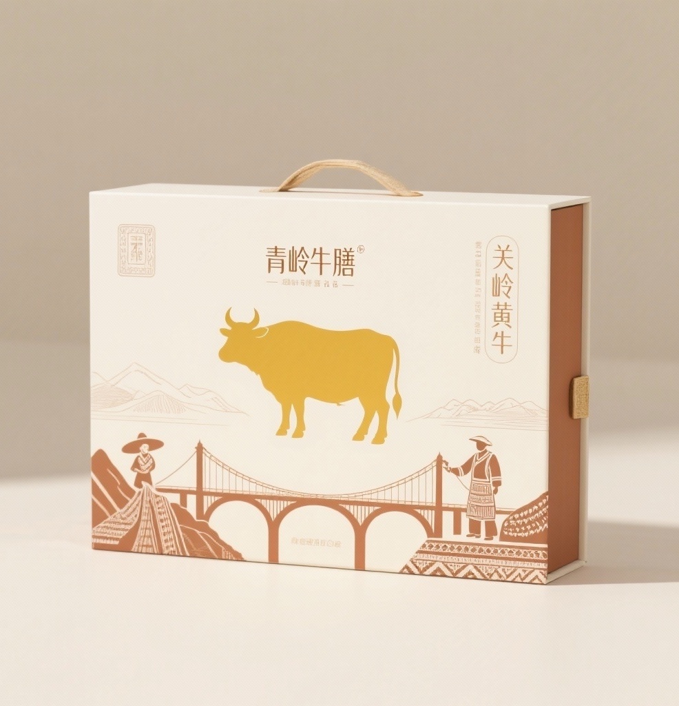 - **产品**:关岭黄牛 - **品牌名**:青岭牛膳 - **包装样式**:礼品盒 - **设计风格**:简约创意风 - **设计元素**:黄牛正负图形、花江峡谷大桥、布依族纹样、山图形、农民图形、布制感机制 - **主题配色**:米白色、浅赭石色