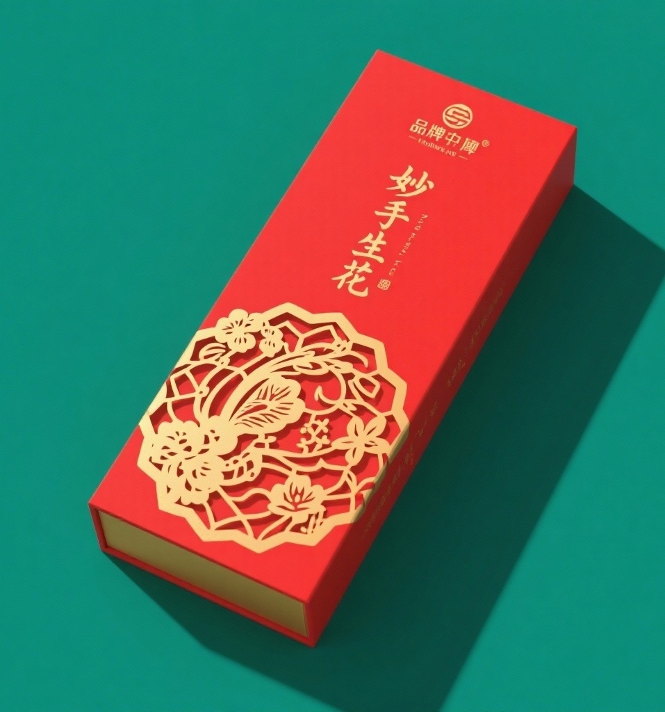 - **产品**:剪纸包装 - **品牌名**:妙手生花 - **包装样式**:长方形盒 - **设计风格**:扁平矢量 - **设计元素**:中国风、特色剪纸图案、手写体品牌文字 - **主题配色**:中国红与金色