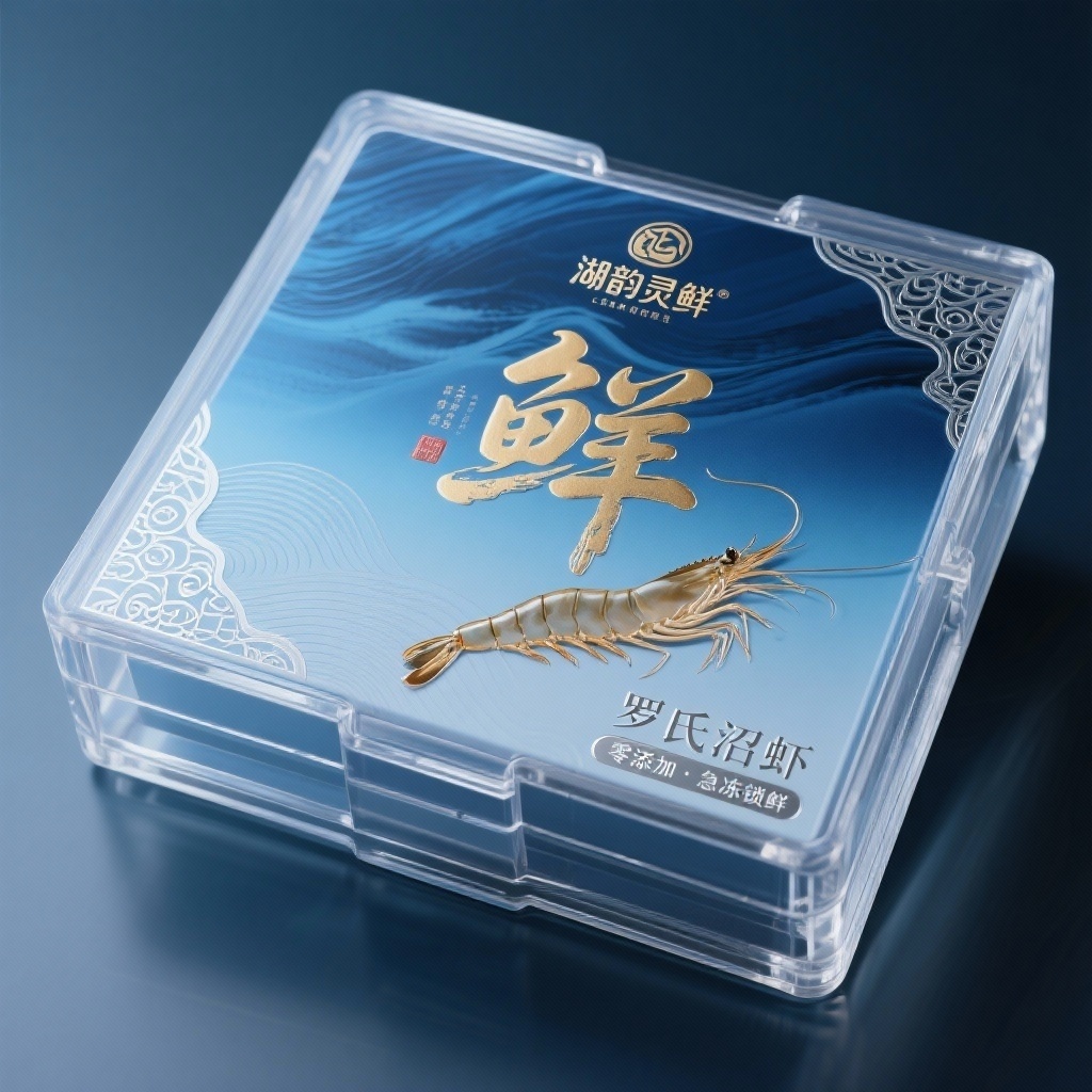 > 2. 波纹UV印刷层仅覆盖盒面边缘20%区域,确保80%透明区展示虾体