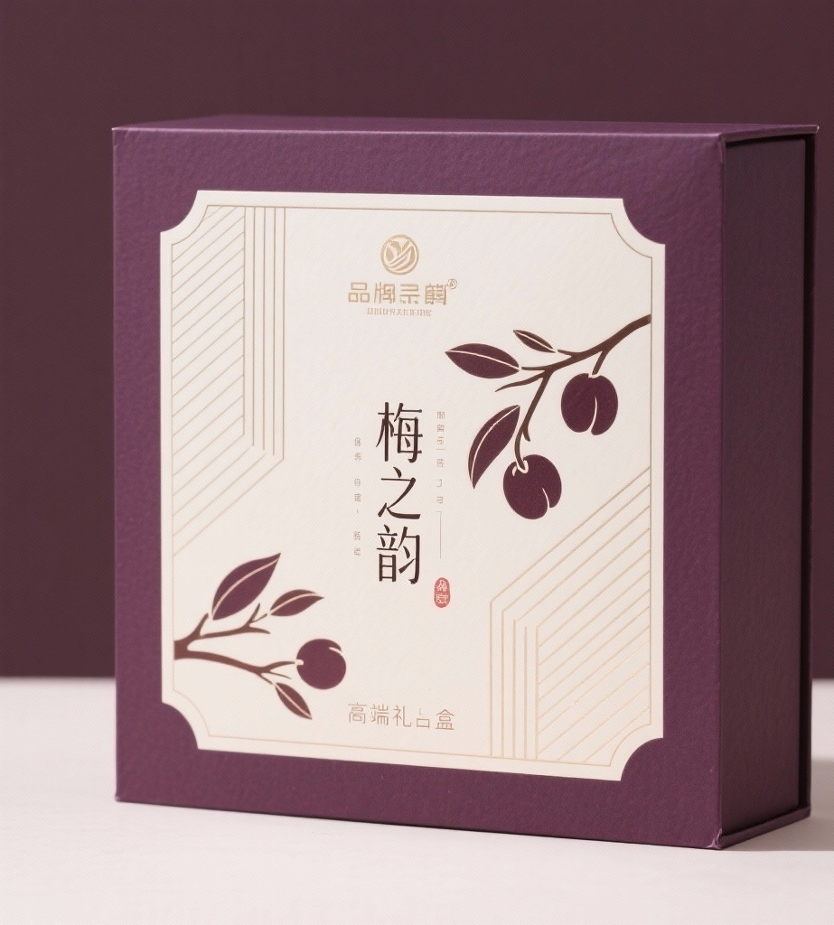 - **产品**:梅子干 - **品牌名**:梅之韵 - **包装样式**:礼品盒 - **设计风格**:自然简约风 - **设计元素**:梅子图案、枝条纹饰、简约几何边框 - **主题配色**:深紫与米白