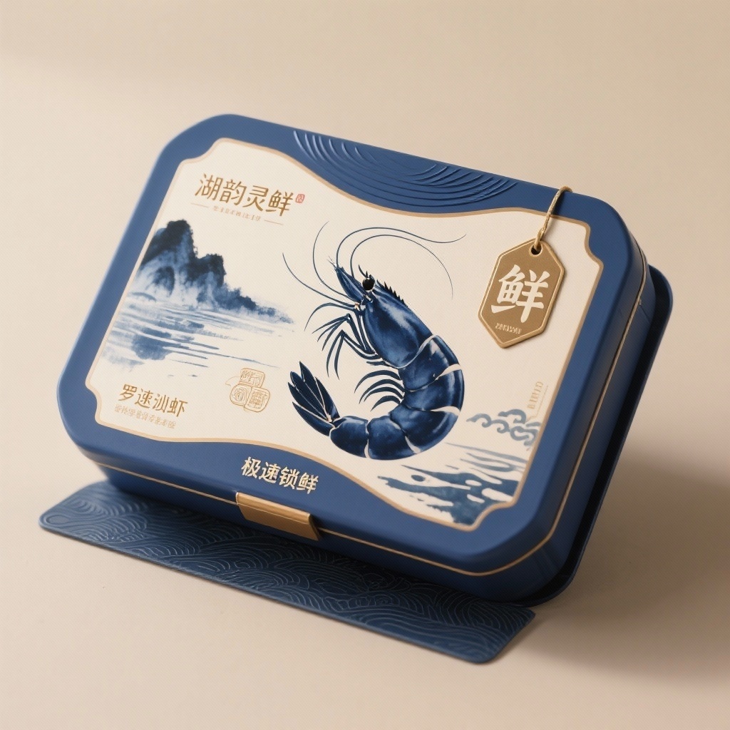 - **水墨元素**:深蓝晕染虾形水墨画(半透叠于实拍图底层)