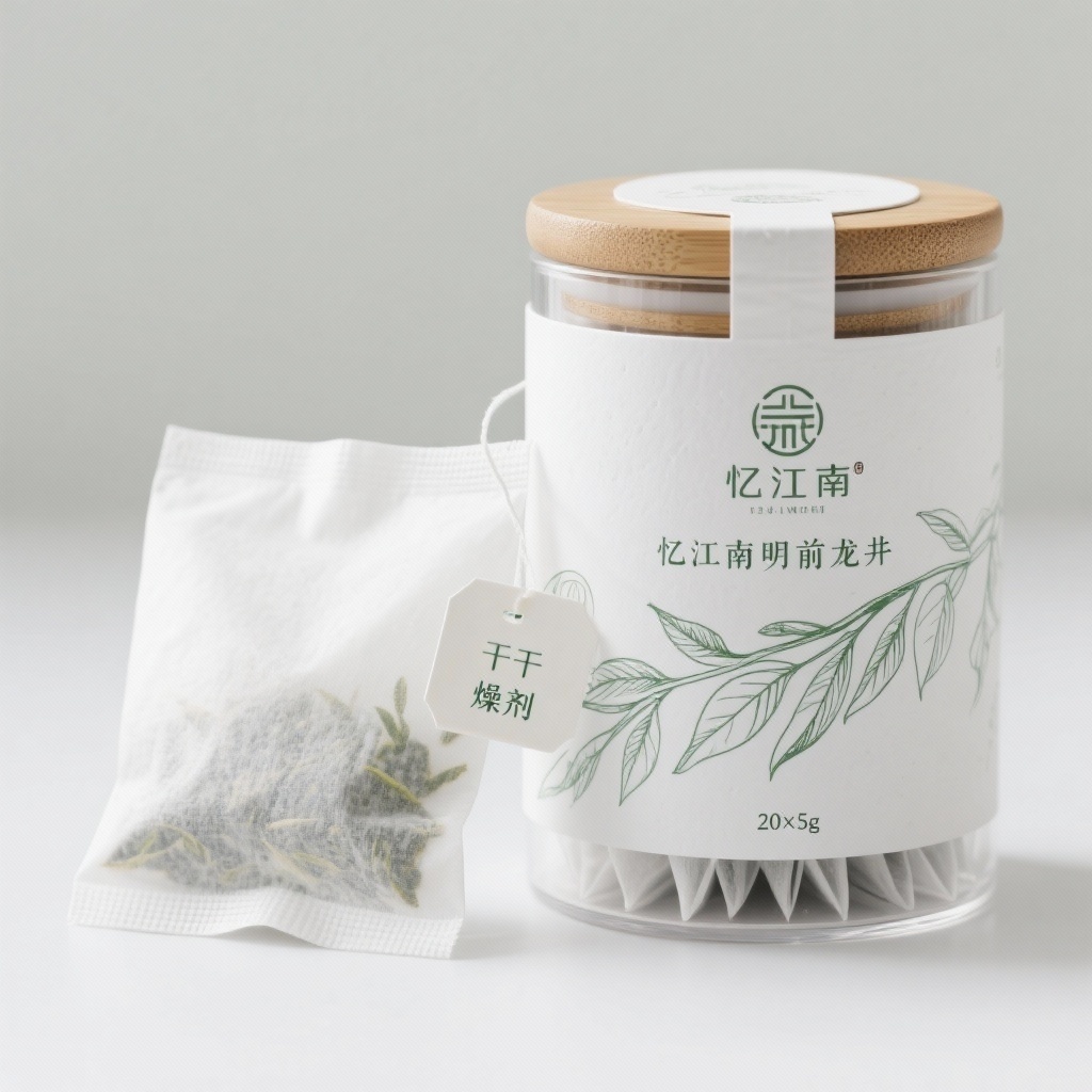 (根据需求补充内包装设计:茶包采用20袋/罐分装,每袋5g,棉纸袋印有与罐身统一的茶叶线稿;防潮剂为无纺布小包,印极简"干燥剂"字样,置于罐内分隔板下方)