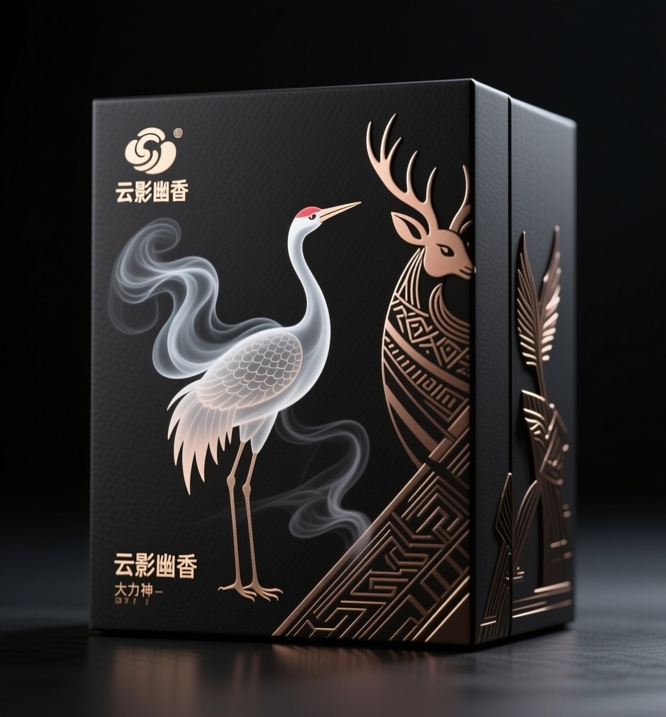 一个高端香薰蜡烛礼品盒,品牌名为“云影幽香”,采用现代东方美学风格。视觉焦点是一只由缥缈烟雾构成的仙鹤,袅袅烟缕优雅升腾,形态虚实相生,半透明质感让玄色基底若隐若现。黎族“大力神”纹样以精简的现代几何线条呈现,具有深青铜或枪灰色的暗金属质感;抽象化的鹿首、鸟羽等动物图腾以浮雕形式隐现于包装侧面。品牌标识通过哑光与局部UV工艺处理,在玄色背景中浮现出若有似无的金属光泽。包装材质为磨砂触感的特种纸,烟纹处有局部光油工艺。整体光影运用低饱和暖光与冷调阴影对比,通过3D渲染展现立体层次,仙鹤烟雾尾迹呈现渐变透明效果,图腾浮雕处有细腻光影过渡,营造出深邃而富有呼吸感的神秘氛围。