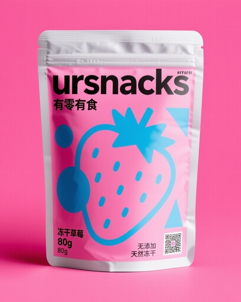 为“ursnacks”(中文名:有零有食)品牌的冻干草莓设计一款80g铝箔自立袋包装,采用简约几何风格,整体干净现代。设计元素包括:主视觉为草莓的简洁剪影轮廓,以抽象几何线条勾勒,醒目而富有设计感;背景为纯色亮粉红(#FF6F91),营造活力氛围;细节处加入蓝色(#4A90E2)几何图形(如圆形、三角)作为点缀,增强视觉层次;品牌英文名“ursnacks”使用超大无衬线字体居中突出,中文“有零有食”以小字辅助排版;清晰标注“冻干草莓”“80g”“无添加”“天然冻干”等核心信息,并在角落嵌入微型二维码;整体采用哑光铝箔材质质感,搭配局部亮面印刷,体现环保与高级感。配色以粉红为主色、蓝色为点缀色,形成鲜明对比,契合年轻、健康、天然的品牌调性。