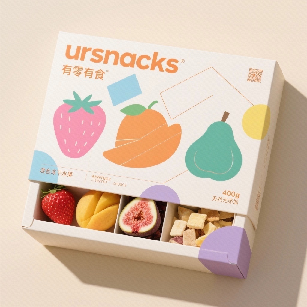 为“ursnacks”(中文名:有零有食)品牌设计一款400g混合冻干水果礼箱包装,内含草莓、芒果、无花果三种口味,采用简约几何风格,整体干净高级。设计元素包括:主视觉为三种水果(草莓、芒果、无花果)的简洁剪影轮廓,以抽象几何线条呈现,错落排布于画面中央;背景为中性米白色(#F8F5F0),营造温暖自然的礼盒氛围;细节处融入三组主题色几何点缀——粉蓝(#FF6F91 + #4A90E2)、橙绿(#FFA726 + #00C853)、紫黄绿(#9C27B0 + #CCFF00),以小面积色块或线条呼应内装口味;品牌英文名“ursnacks”以大号无衬线字体置于顶部醒目位置,中文“有零有食”优雅辅助;清晰标注“混合冻干水果”“400g”“天然无添加”等信息,并在侧边或角落嵌入二维码;整体采用环保纸材,表面为细腻哑光覆膜,局部烫印亮色几何图形,提升质感与互动性。设计兼顾系列统一性与礼赠仪式感,适合年轻消费者与国际市场。