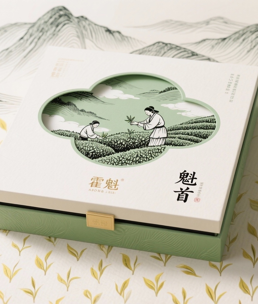 为“霍魁”品牌的霍山黄芽茶叶“魁首”系列设计一款天地盖结构的高端礼盒包装,采用线稿版画风格,整体清新雅致且富有文化底蕴。设计元素包括:主视觉为“魁首”二字的外轮廓镂空造型,内部填充细腻的采茶场景插画——茶农身着传统服饰在云雾缭绕的霍山茶园中采摘嫩芽;背景以霍山连绵山脉的简约线稿为基底,层叠起伏,营造深远意境;底纹巧妙融入黄芽茶叶的自然形态,以重复韵律铺陈,增强肌理感而不喧宾夺主;品牌标识“霍魁”以古朴书法字体置于盒盖下方,与整体风格和谐统一。主题配色以主色嫩绿色(#A8D8B9)为基调,传递茶叶的鲜爽与自然生机;点缀色采用深墨黑(#2E2929)勾勒所有线稿细节,确保版画的清晰与力度;辅助色使用温润米白(#F8F4E9)作为底色,模拟宣纸质感,提升整体高级感与呼吸感。包装工艺建议采用环保纸材、局部烫哑光绿及凹凸压纹,突出“魁首”轮廓与茶叶肌理。