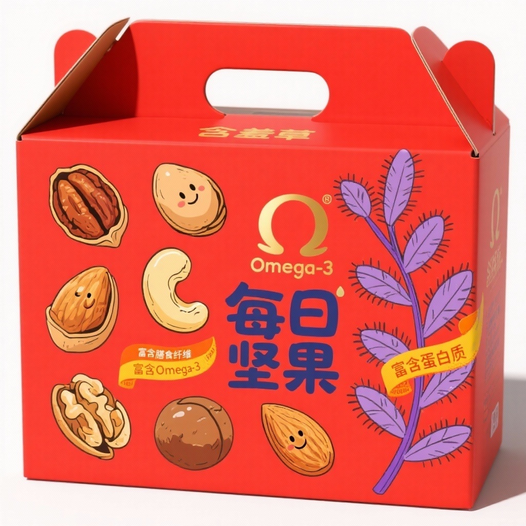 为“含羞草”品牌每日坚果重新设计一款手绘插画风格的手提盒包装,盒型保留实用手提结构,边缘采用柔和圆角提升亲和力。整体以高饱和正红色(#D32F2F)为基底,营造强烈货架存在感。主视觉为一组风格统一的手绘六种坚果插画(碧根果仁、腰果仁、夏威夷果仁、核桃仁、巴旦木仁等),以自然姿态错落排布,部分坚果带有微妙表情或动态,突出“全坚果”的真实与活力,但避免过度卡通化以维持品质感。画面中巧妙融入含羞草植物——叶片以手绘线条勾勒,从盒面一侧蜿蜒生长,叶尖轻触坚果,形成品牌专属视觉锤。Omega-3以创意图标呈现:Ω符号融合金色光晕或水滴形态,置于显眼位置,并搭配“富含Omega-3”手写字体标签。营养信息“富含膳食纤维”“富含蛋白质”以彩色飘带或印章形式点缀。色彩系统大胆融合三原色与暖调层次:明黄(#FFD700)用于高光与阳光元素,活力橙(#FB8C00)强化卖点标签,深蓝(#1976D2)用于文字描边与含羞草茎脉,紫(#9C27B0)作为装饰线条或阴影细节,整体色彩丰富、节奏明快却不失协调。背面延续插画语言,用柔和色块框出科学说明:“α-亚麻酸(Omega-3多不饱和脂肪酸)是人体必需脂肪酸,在人体内可经代谢产生 EPA 和 DHA”,字体清晰、排版呼吸感强。整体风格温暖、生动、富有叙事性,在保持商业识别度的同时传递自然与关怀的品牌温度。