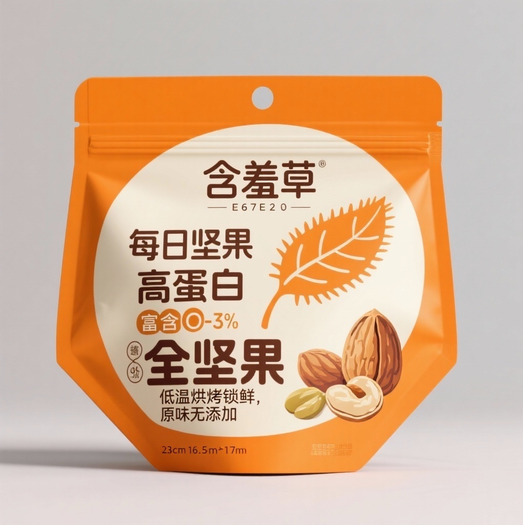 为“含羞草”品牌的每日坚果产品设计一款八边封袋包装(尺寸23cm×16.5cm×7cm,带10mm圆孔),采用简约现代风格,强调品牌识别与核心卖点。整体以活力橙(#E67E22)为主色调,营造强烈视觉吸引力;坚果插画大幅缩小,仅作为辅助装饰元素点缀于角落或底部,避免分散注意力;核心卖点如“富含ω-3”“高蛋白”“全坚果”“低温烘烤锁鲜,原味无添加”以大号粗体字或醒目图标置于包装正面中央区域,信息清晰突出;品牌专属视觉锤——含羞草叶片图形被显著放大,环绕圆孔或居中布局,与品牌名“含羞草”紧密结合,形成强记忆点;文字与图标使用深棕(#5C4033)增强对比,关键信息辅以米白(#F5F5DC)底衬提升可读性。整体设计简洁有力,卖点明确,视觉锤突出,强化货架识别与消费者印象。