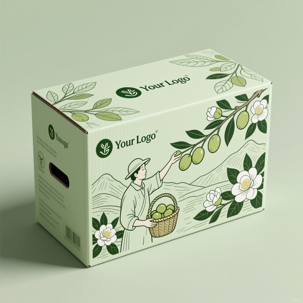 - **产品**:橄榄油 - **品牌名**:Your Logo - **包装样式**:长方形瓦楞纸箱 - **设计风格**:线稿风格与插画风格结合 - **设计元素**: 正面:采摘橄榄场景线稿(人物手持竹篮采摘),背景穿插山茶花枝; 侧面:橄榄枝叶与山茶花缠绕的线稿图案; 背面:橄榄果实在山茶花簇拥下的插画; 顶面:橄榄叶脉络线稿围绕品牌标识 - **主题配色**:浅绿色(#C8E6C9)