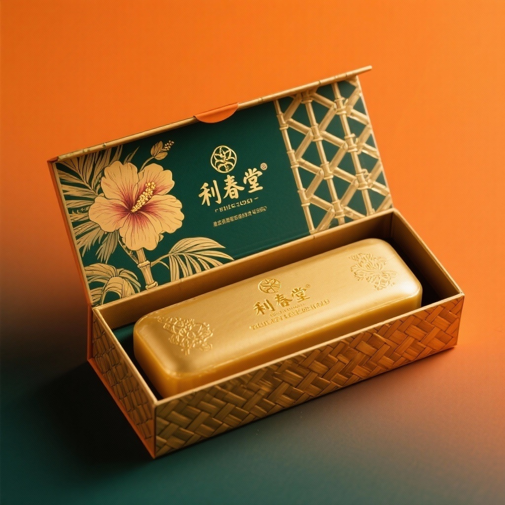 - **产品**:黄金皂(英文) - **品牌名**:利春堂 - **包装样式**:超长方形翻盖盒 - **设计风格**:东南亚热带花卉风格 - **设计元素**:手绘木槿花瓣、竹编纹理、烫金几何图案、金色品牌LOGO - **主题配色**:暖橙色(主背景)、深绿色(渐变过渡)、金色(点缀色) (方案优化说明:整块黄金皂采用超长方形盒型确保产品完整展示,竹编纹理压印呼应天然属性,烫金几何纹强化国际感,暖橙与深绿渐变背景凸显热带活力,金色LOGO与皂体呼应提升轻奢质感)