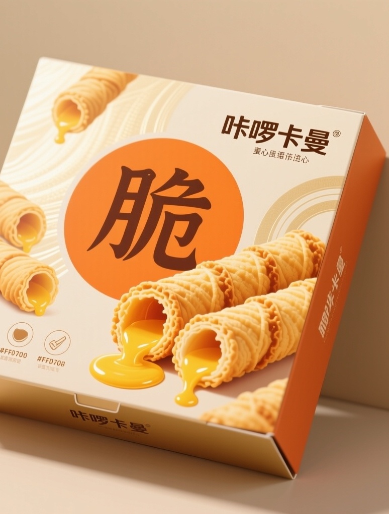 为“咔啰卡曼”品牌的流心蛋卷注心饼干精心设计一款翻盖式扁平纸盒包装,采用简约精致且富有创意构图的插画风格,整体呈现高端大气的视觉感受。设计元素包括:主视觉为几根金黄酥脆、切开后流心缓缓溢出的蛋卷插画,质感细腻诱人;背景采用柔和浅金纹理,营造轻盈高级的氛围;细节处融入三个卖点图标与简洁文案装饰,布局平衡而不杂乱;画面中央设有一个醒目的大圆圈,内书一个遒劲有力的“脆”字,强化产品核心口感;品牌标识“咔啰卡曼”以优雅定制字体置于包装上方或侧边,与整体设计和谐统一。主题配色以主色活力橙(#FFA500)奠定温暖食欲基调,点缀色阳光黄(#FFD700)突出流心与酥脆质感,辅助色浅金(#F5DEB3)用于背景与细节勾勒,提升整体精致度与高级感。画面展示包装正面,高清8K画质,注重材质与光影细节表现。