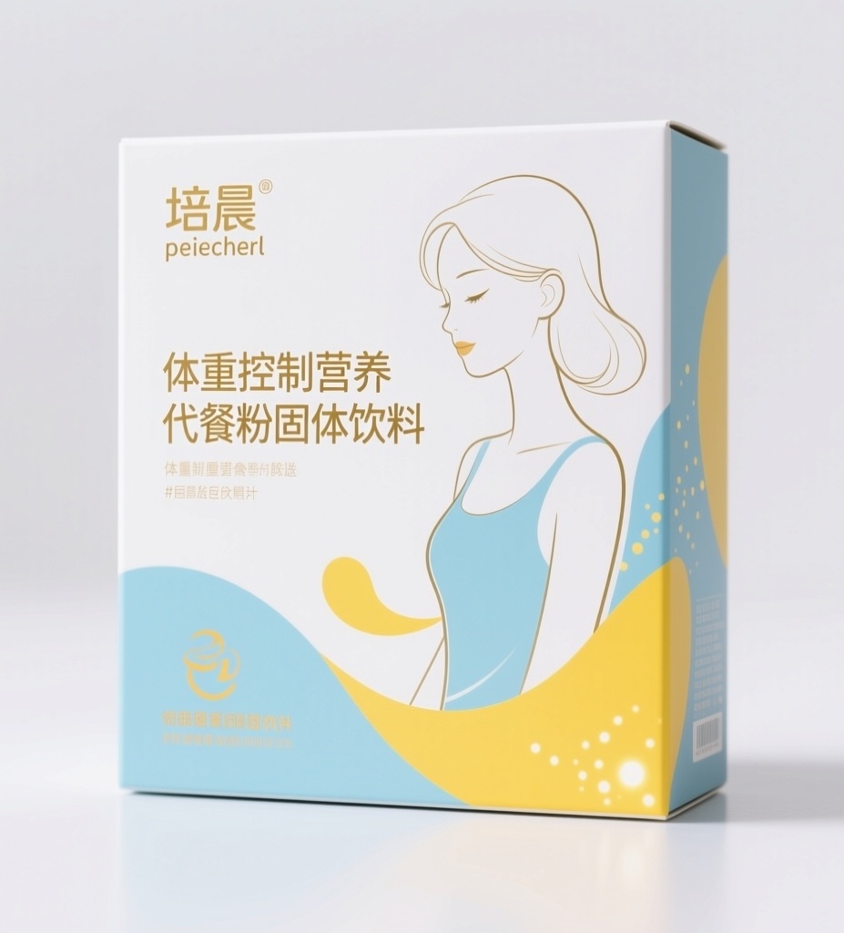 为“培晨(peiecherl)”品牌的体重控制营养代餐粉固体饮料精心设计一款卡纸盒包装,整体风格简约高档。主视觉采用优雅的女性简笔画插画,线条流畅柔和,体现健康与轻盈感;背景以纯净白色为主,营造干净清爽的视觉基调;细节处点缀淡雅蓝色与活力黄色图形元素,如微光粒子或抽象曲线,增强现代感与活力;产品名称“体重控制营养代餐粉固体饮料”采用烫金工艺,字体精致利落,置于正面显眼位置;品牌标识“培晨”以低调烫金或压印方式呈现,保持整体高级感。主题配色以主色浅蓝(#87CEFA)传递清新与信赖,点缀色明黄(#FFD700)提升视觉焦点与能量感,辅助色纯白(#FFFFFF)强化洁净与专业形象,整体配色和谐统一,契合健康营养的品牌定位。
