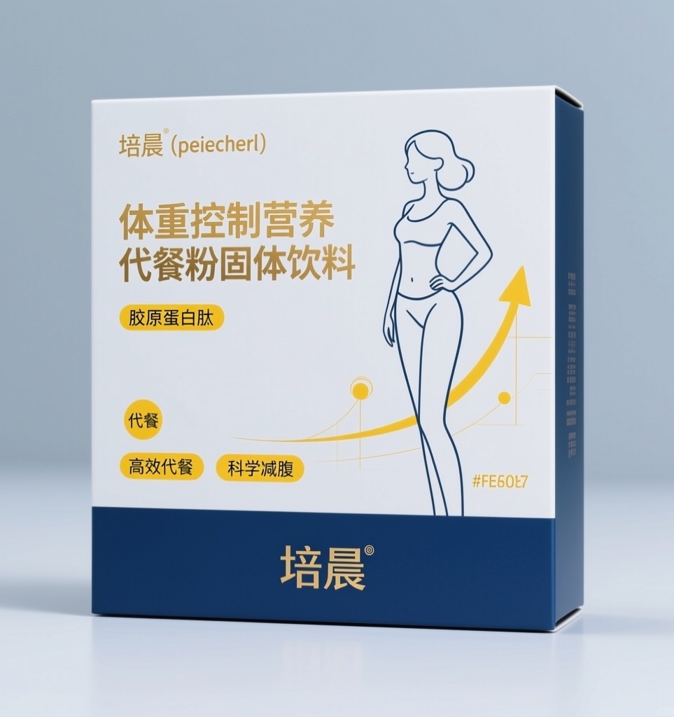 为“培晨(peiecherl)”品牌的体重控制营养代餐粉固体饮料重新设计卡纸盒包装,风格保持简约高档,但减少大面积白色,强化减肥功效的视觉传达。主视觉采用一位姿态轻盈、线条流畅的女性简笔画插画,身形修长,传递健康塑形理念;背景以低饱和度灰蓝(#E6F0FA)替代纯白,营造专业、洁净而不空洞的基底;在画面中融入极简的上升箭头、体重曲线或抽象代谢线条等隐喻元素,低调暗示减脂与代谢提升。产品名称“体重控制营养代餐粉固体饮料”以烫金工艺突出呈现,字体加粗并置于视觉中心;“胶原蛋白肽”“代餐”“轻盈饱腹”等功效关键词以明黄色(#FFD700)小标签或图标形式点缀,增强功能识别。品牌名“培晨”以精致烫金压印于盒面下方,保持低调高级感。整体配色以主色深蓝(#4A90E2)传递专业与信赖,点缀色明黄(#FFD700)聚焦功效信息,辅助色浅灰蓝(#E6F0FA)平衡视觉,金色(#D4AF37)提升质感,整体设计聚焦“高效代餐、科学减脂”的核心诉求。