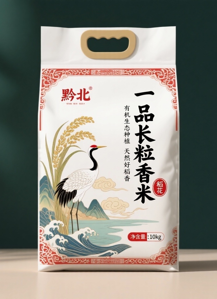 **产品**:一品长粒香米 **品牌名**:黔北 **包装样式**:包装袋 **设计风格**:传统中式风格 **设计元素**:装饰纹样、工笔插画(仙鹤、稻穗、山峦、祥云、海浪)、书法字体“有机生态种植 天然好稻香”、黑色字体“一品长粒香米”、红色圆形印章“稻花香”、品牌标识“黔北”、净含量标签“净含量:10kg” **主题配色**:米白色底色、红色、黑色