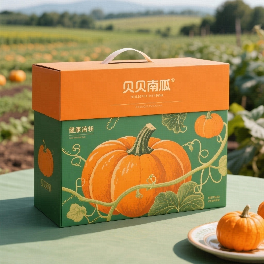 **产品**:南瓜 **品牌名**:贝贝南瓜 **包装样式**:礼品盒 **设计风格**:自然健康清新 **设计元素**:南瓜,藤蔓,农田,盘子 **主题配色**:橙色,绿色