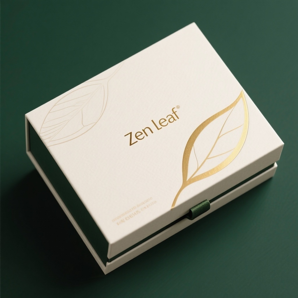- **产品**:优质有机茶叶 - **品牌名**:ZenLeaf - **包装样式**:礼品盒 - **设计风格**:极简现代 - **设计元素**:抽象叶子图案、金色烫印徽标 - **主题配色**:米白、深绿