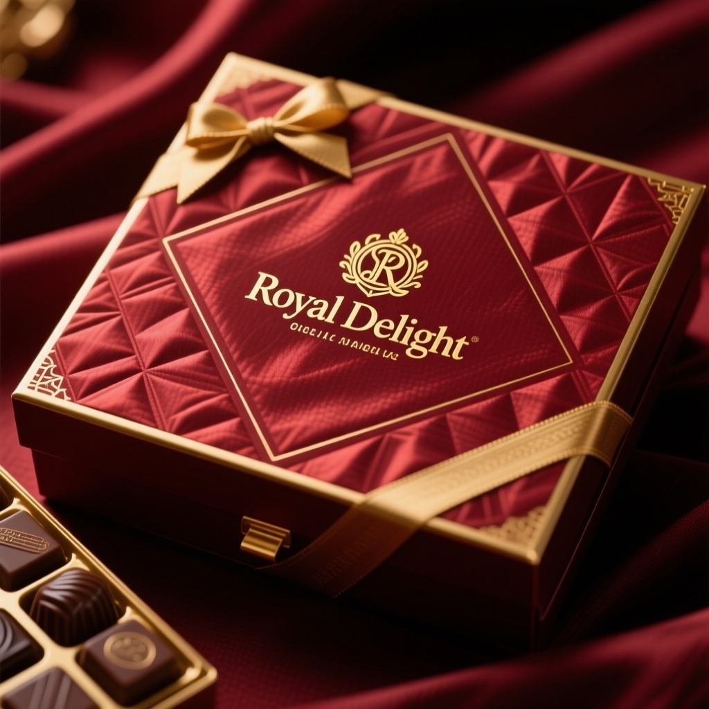 - **产品**:高级巧克力礼盒 - **品牌名**:Royal Delight - **包装样式**:礼品盒 - **设计风格**:奢华典雅风格 - **设计元素**:丝绸纹理表面、金色浮雕品牌标识、简约几何暗纹 - **主题配色**:深红色为主,金色点缀