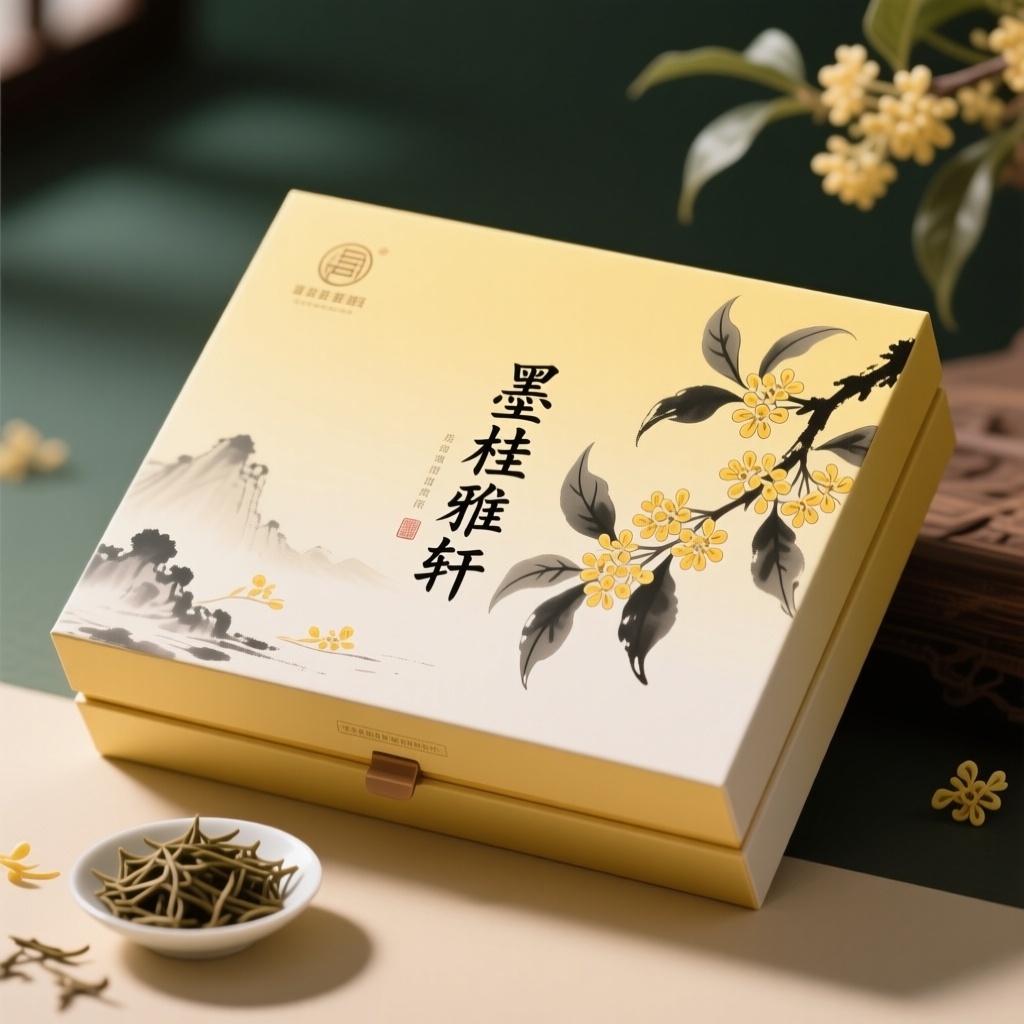 - **产品**:桂花茶 - **品牌名**:墨桂雅轩 - **包装样式**:礼品盒 - **设计风格**:水墨画风格 - **设计元素**:水墨桂花图案 - **主题配色**:淡黄色渐变