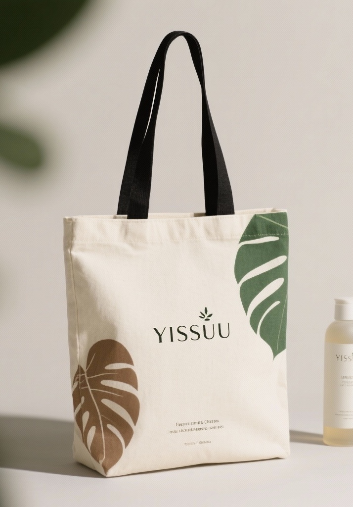 - **产品**:沐浴露 - **品牌名**:YISUU - **包装样式**:手提袋 - **设计风格**:极简自然风 - **设计元素**:品牌标识、树叶纹理、简洁文字排版 - **主题配色**:米白色、黑色、绿色、棕色
