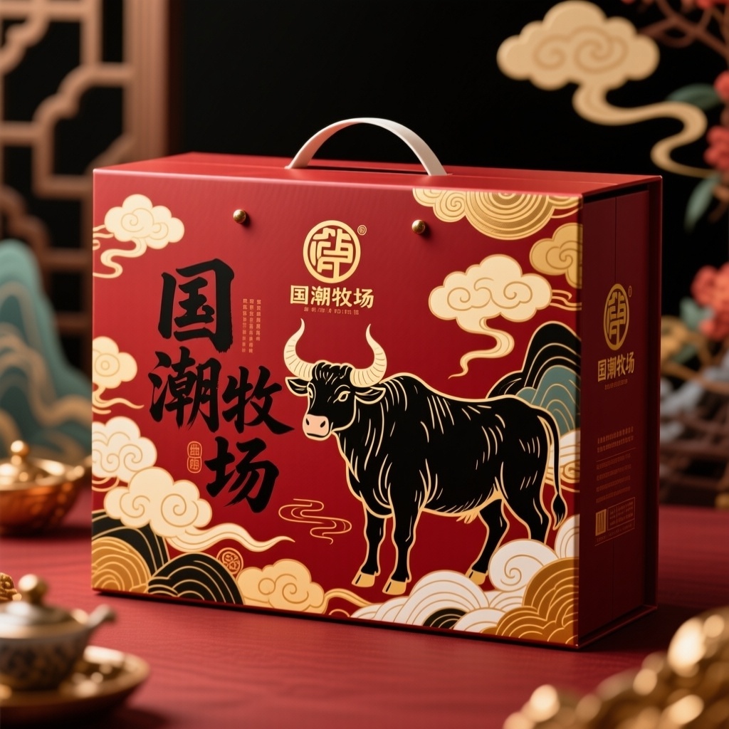 - **产品**:牛肉礼盒 - **品牌名**:国潮牧场 - **包装样式**:礼品盒 - **设计风格**:国潮插画风格 - **设计元素**:国潮风格牛插画、祥云图案、书法字体品牌标识 - **主题配色**:深红、金色、黑色