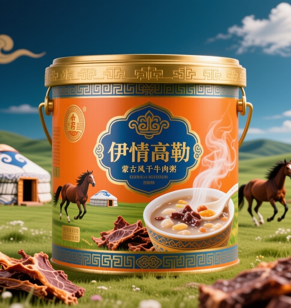 - **产品**:蒙古风干牛肉粥 - **品牌名**:伊情高勒 - **包装样式**:桶装 - **设计风格**:中式古典 - **设计元素**:产品名称(突出)、草原、蒙古包、奔腾骏马、风干牛肉特写、热粥蒸汽 - **主题配色**:橙、蓝、金、绿