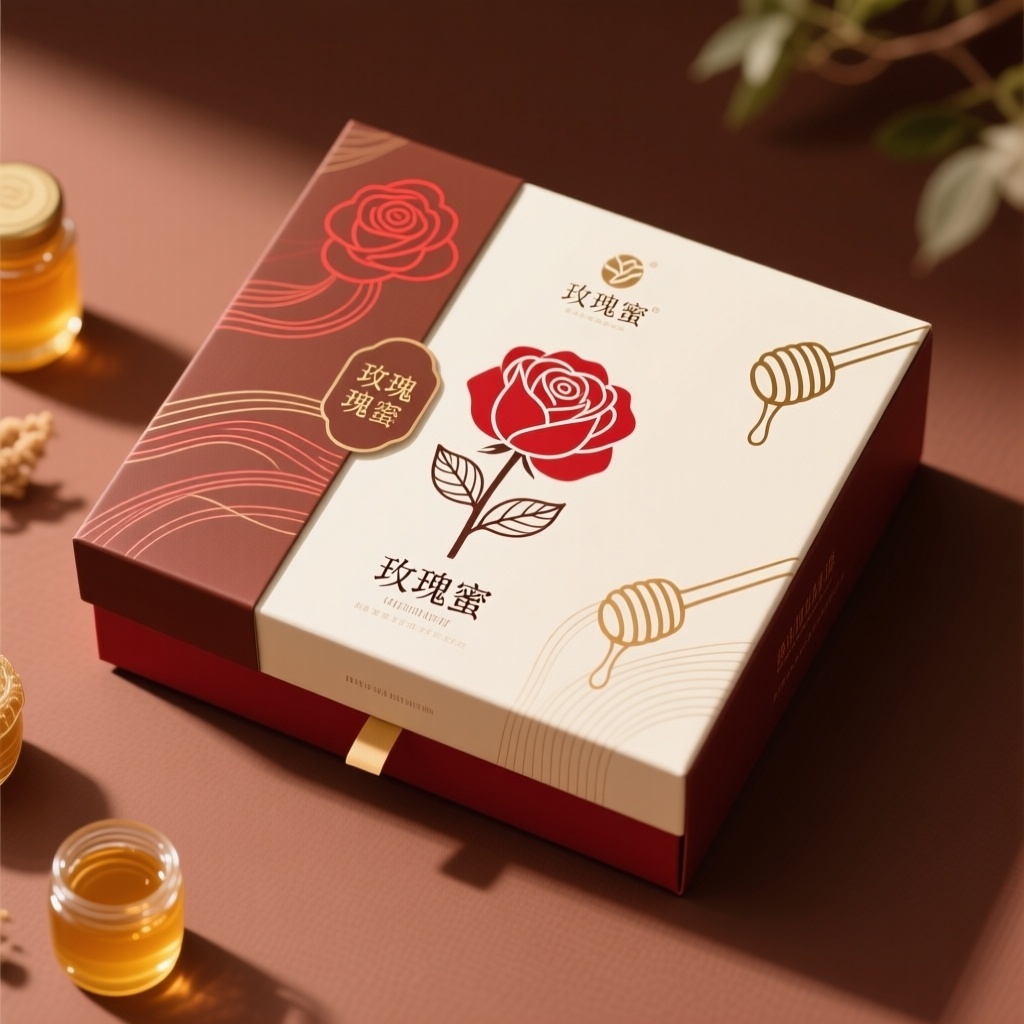 - **产品**:蜂蜜 - **品牌名**:玫瑰蜜 - **包装样式**:礼品盒 - **设计风格**:简约自然 - **设计元素**:红玫瑰线条图案、蜂蜜线条图案 - **主题配色**:红棕色、米白色