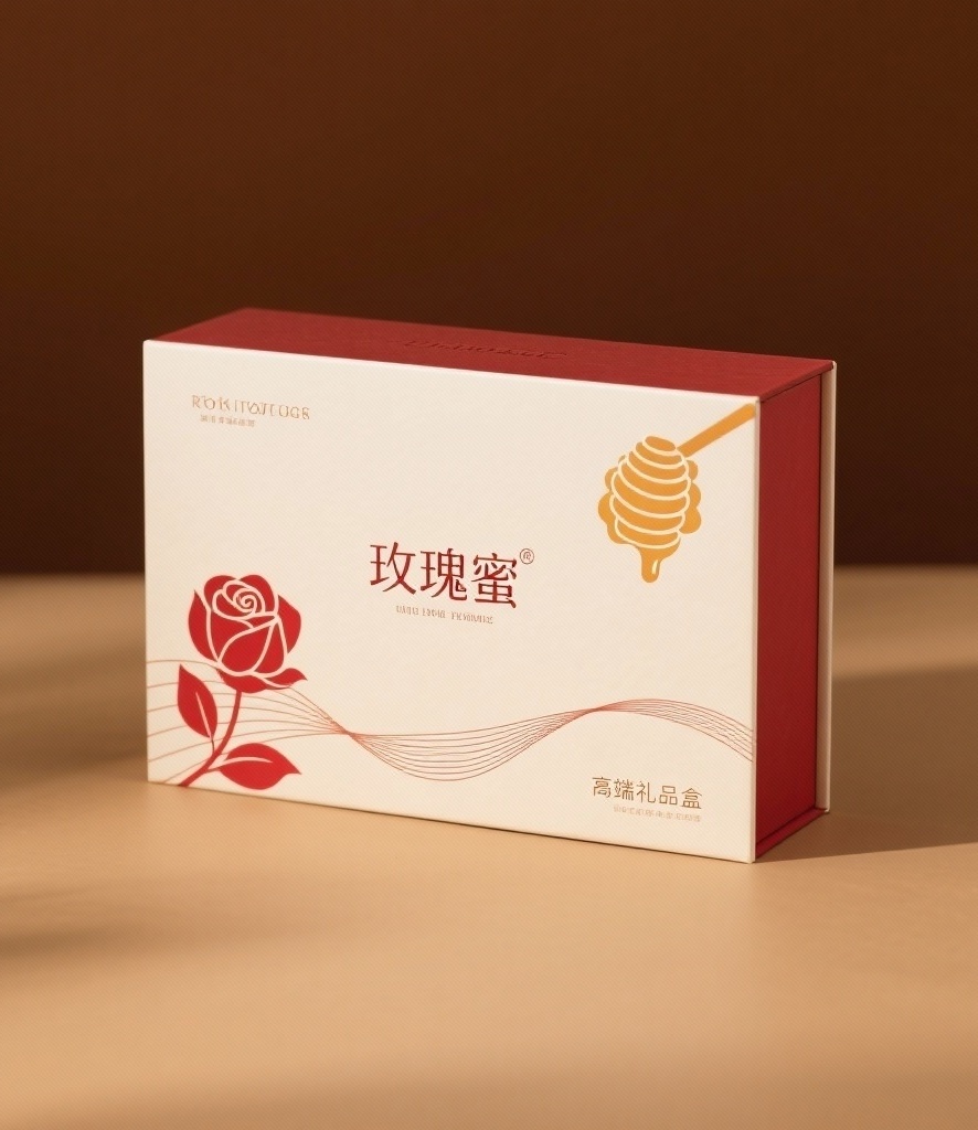 - **产品**:蜂蜜 - **品牌名**:玫瑰蜜 - **包装样式**:礼品盒 - **设计风格**:简约自然 - **设计元素**:红玫瑰线条图案、蜂蜜线条图案 - **主题配色**:红棕色、米白色