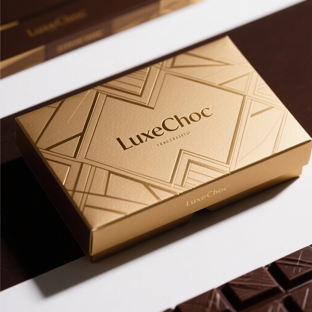 - **产品**:巧克力 - **品牌名**:LuxeChoc - **包装样式**:礼品盒 - **设计风格**:简约奢华 - **设计元素**:几何线条图案、品牌名称浮雕、哑光纹理 - **主题配色**:金、深棕、白