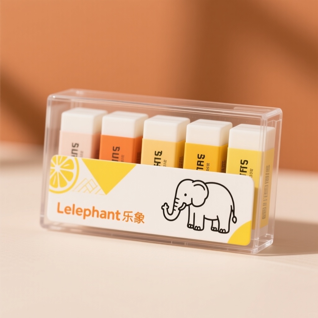 **产品**:5色橡皮擦 **品牌名**:Lelephant乐象 **包装样式**:PP透明盒 **设计风格**:清新手绘极简风 **设计元素**:几何图案、橡皮擦简笔画、大象元素 **主题配色**:暖橙+象牙白+柠檬黄